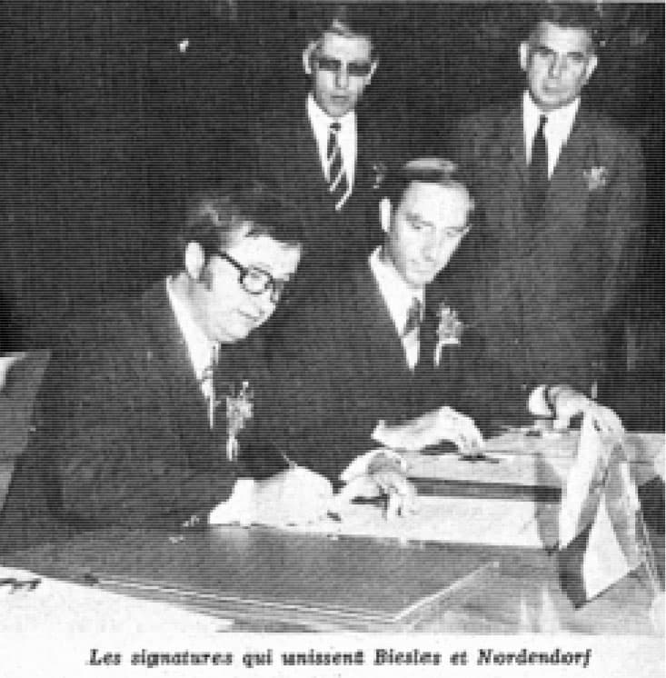Deux années ont passé. Différentes délégations et groupes ont circulé d’un village à l’autre pour ainsi préparer le traité et la signature du jumelage entre Biesles et Nordendorf.