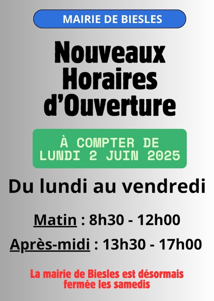 Monsieur le Maire et le Conseil Municipal vous informent que les horaires du secrétariat de la Mairie de Biesles ont changé depuis le 02 juin 2025 :
